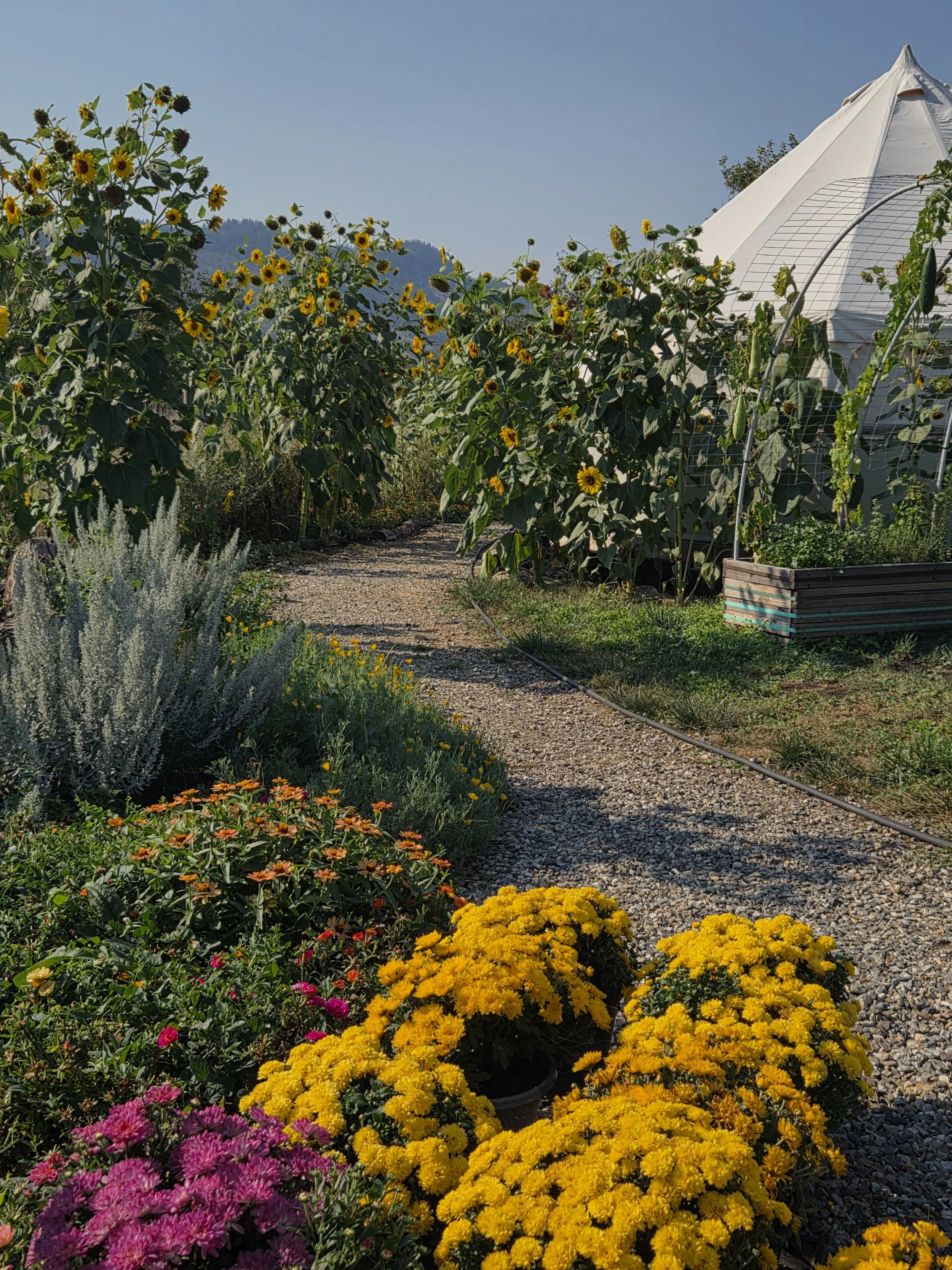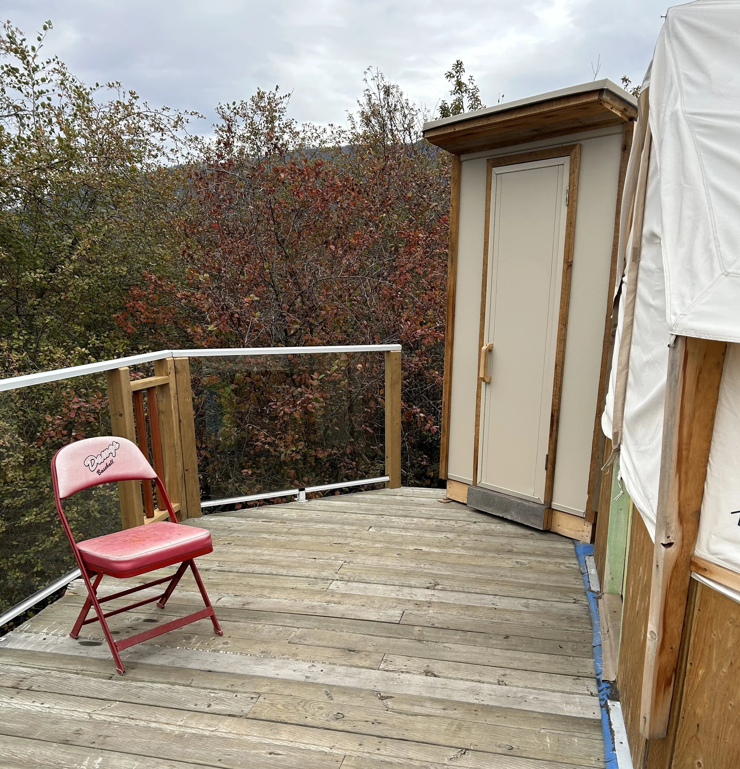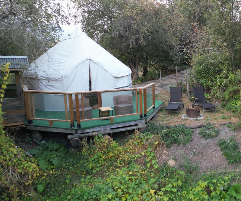 Coyote Den is closest to the garden and green house facilities. The sunflower green fence provides the privacy. The open field to the left of the tent is a gathering a spot for deer, feral horses, coy-wolves and our compost raider, the black bear. There are great deck views capturing the lower coulee area. Best view of the water feature is from the Coyote Den. Facing southwest you will see the ‘Head of the Lake” and best advantage point to check out the red skies at sunset. Two-piece bathroom next to unit, sleeps two, is a bell shape tent.